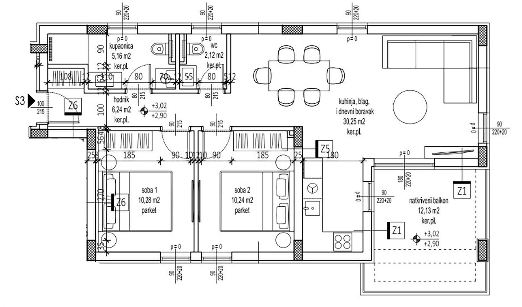 Stan S3 nalazi se na 1. katu na jugoistočnom dijelu zgrade, a sastoji se od: