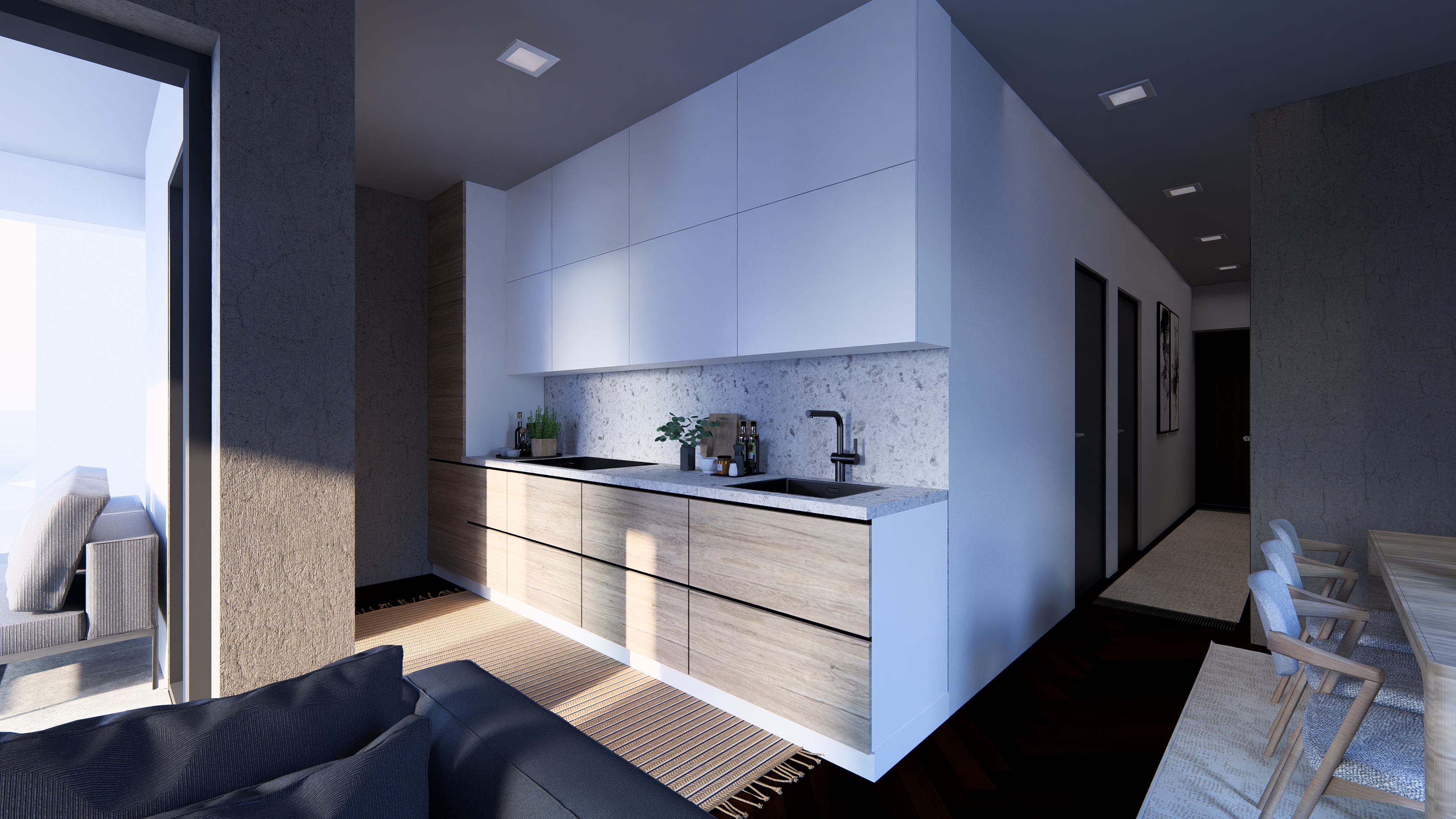 Prostrani dnevni open space boravak povezan s kuhinjom i blagovaonicom stvara moderan i svijetao prostor, savršen za opuštanje i druženje. Velika staklena stijena omogućuje obilje prirodnog svjetla i izlaz na natkriveni balkon.
